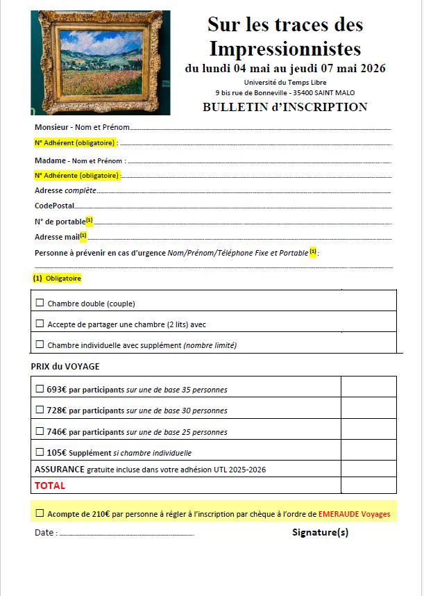 Bulletin d'inscription (à remettre à l'UTL avec chèque d'acompte libellé au nom de Emeraude Voyages)